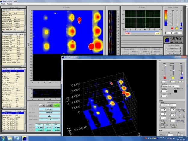 You can inspect defects of test object by air coupled ultrasonic inspection, and you can inspect and measure the detail of abnormal part by the immersion ultrasonic inspection.