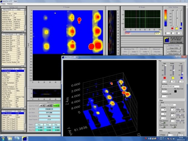 You can inspect defects of test object by air coupled ultrasonic inspection, and you can inspect and measure the detail of abnormal part by the immersion ultrasonic inspection.